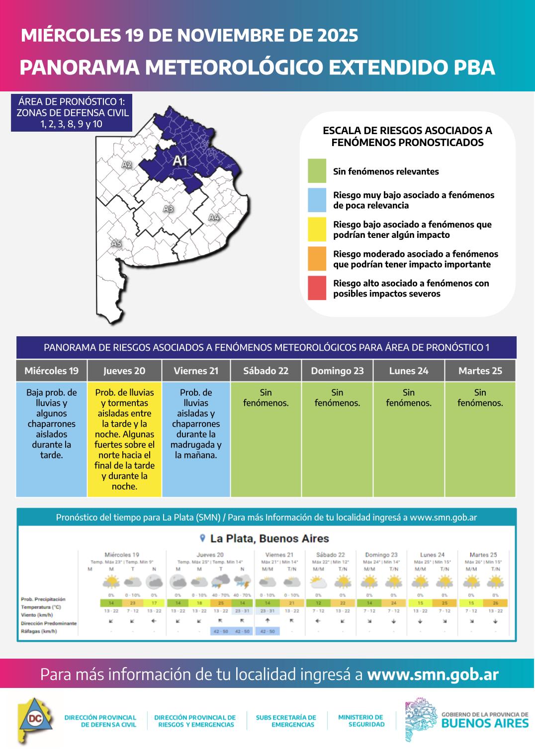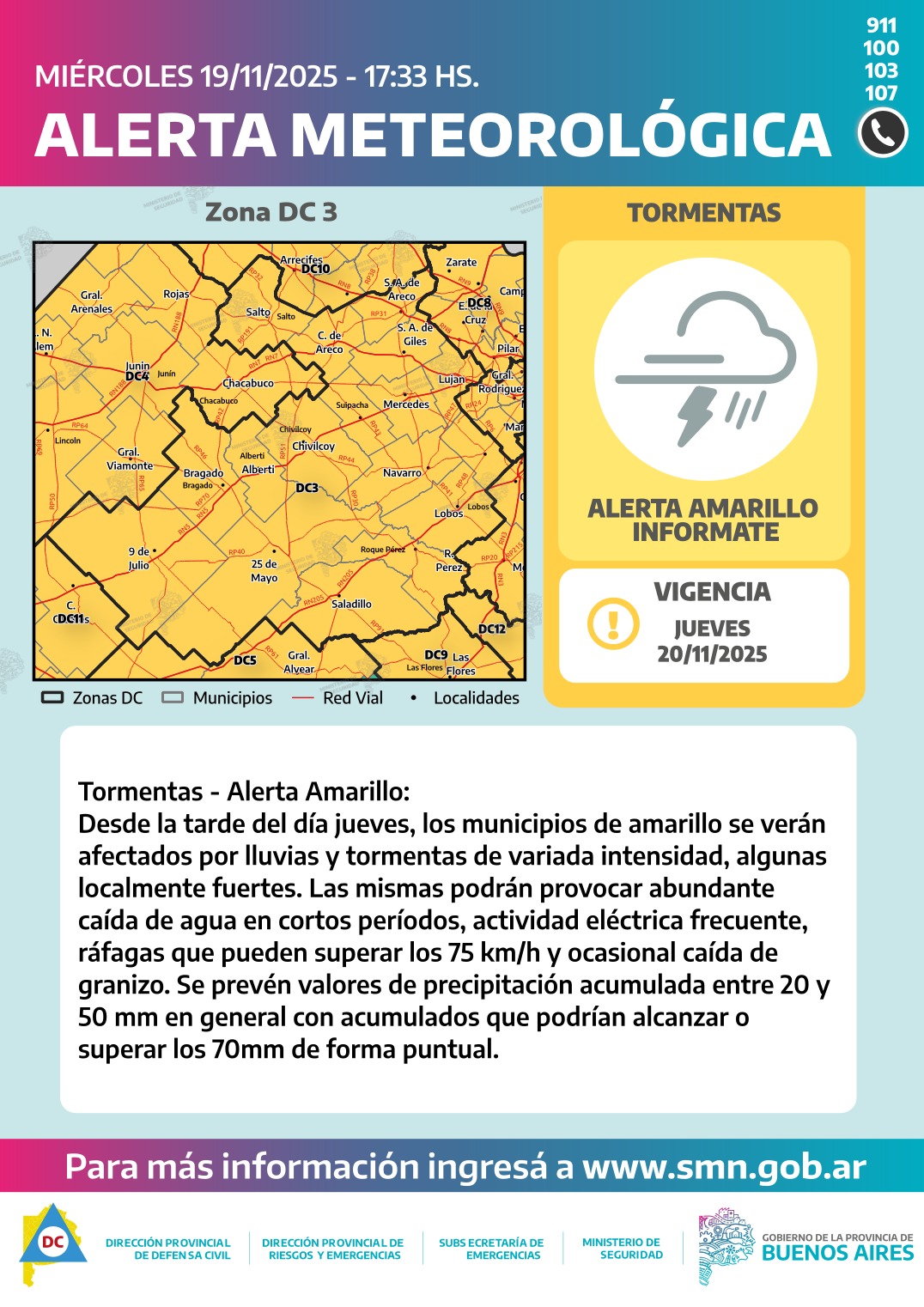 Ante la llegada de este sistema de tormentas, el Servicio Meteorológico Nacional (SMN) ha emitido una alerta amarilla para varias zonas de la provincia. Las áreas más afectadas por la lluvia y las tormentas intensas serán las zonas DC 3, 4, 5, 8, 9, 10, 11 y 12.