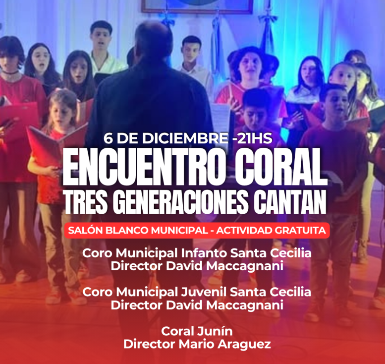 La Municipalidad de Nueve de Julio, a través de la dirección de Cultura, invita al encuentro coral “Tres generaciones cantan”, a desarrollarse el sábado 6 de diciembre, a las 21 hs., en el Salón Blanco Municipal,