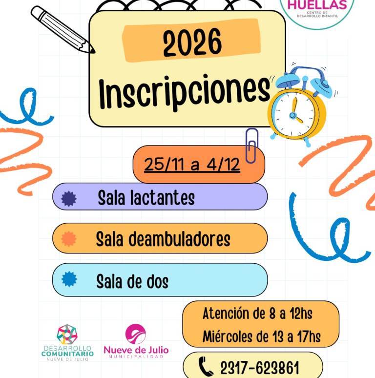El Centro de Desarrollo Infantil “Dejando Huellas”, dependiente de la Secretaría de Desarrollo Comunitario de la Municipalidad de Nueve de Julio, informa que ya están abiertas las inscripciones para el próximo ciclo.