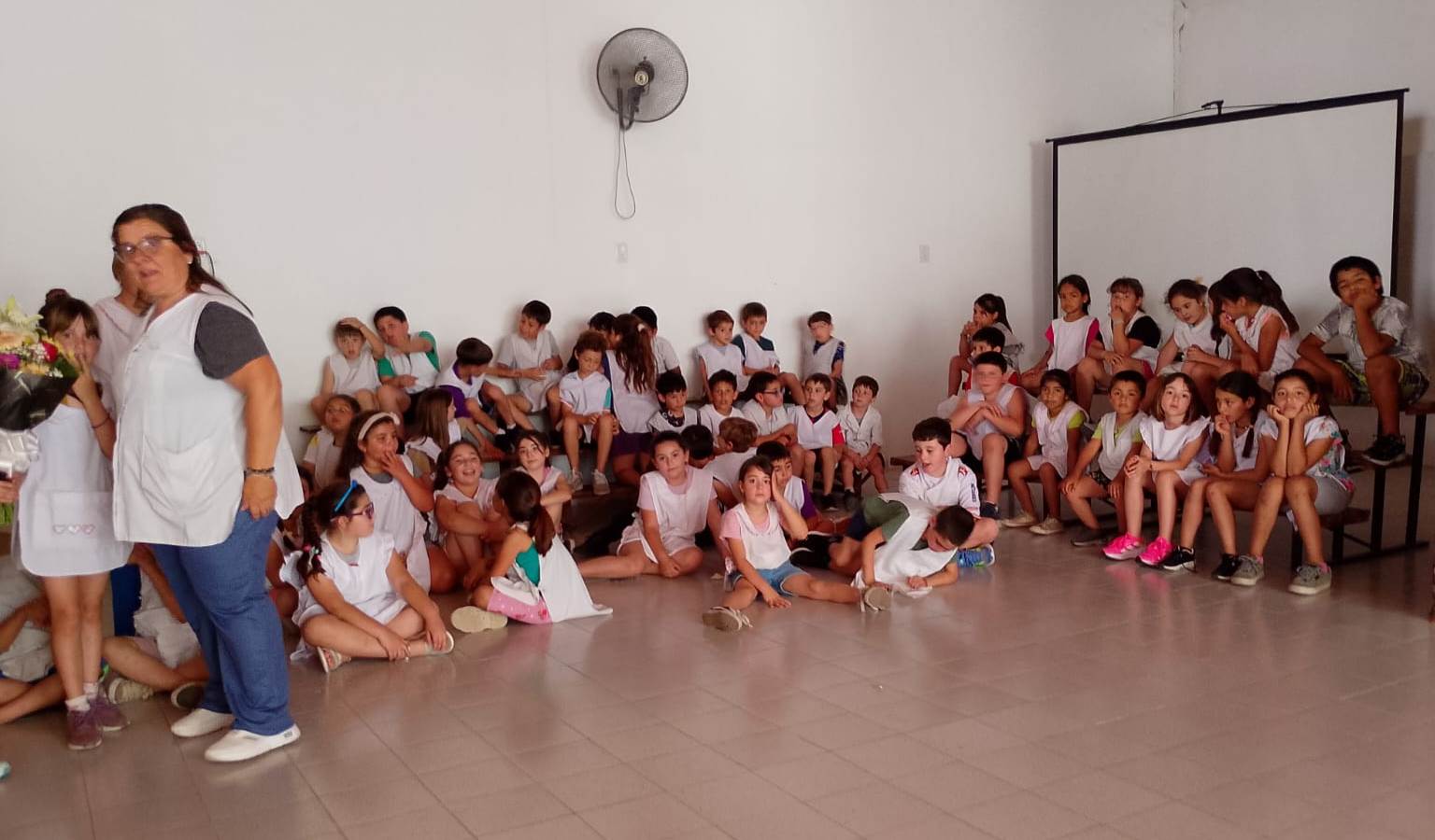 Durante el acto, los alumnos de primer ciclo interpretaron dos canciones del repertorio que Alicia solía enseñar —“Manuelita” y “Arroz con leche”—, seguidos por la proyección de un emotivo audiovisual que recorrió su vida y trayectoria.