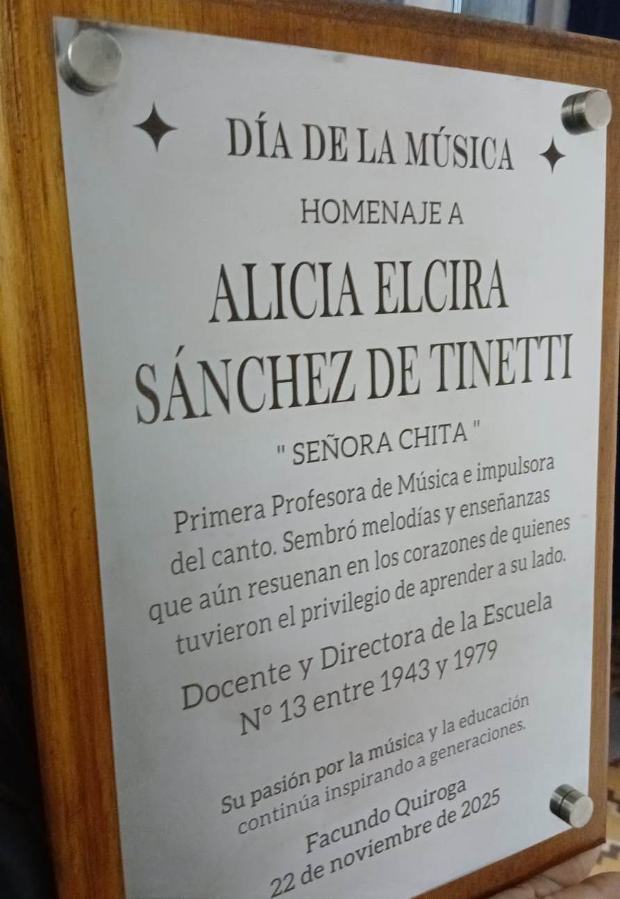 La Escuela Primaria N°13 “Gabriela Mistral” de Facundo Quiroga vivió este miércoles de semana una jornada profundamente emotiva con el acto “Huellas que siguen sonando”, un homenaje dedicado a la memoria y al legado de la profesora Alicia Elcira Sánchez de Tinetti, figura fundamental en la historia educativa y cultural de la comunidad.