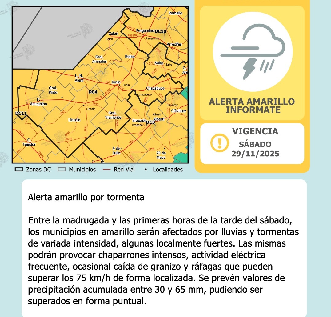 Sábado 29 de noviembre: Se esperan lluvias y tormentas de variada intensidad durante toda la jornada. Las zonas más afectadas serán el centro, noroeste y norte de la provincia. En estas áreas, se podrían registrar tormentas localmente fuertes con ráfagas intensas, caída ocasional de granizo y lluvias muy intensas, lo que podría generar acumulados significativos de agua en poco tiempo.