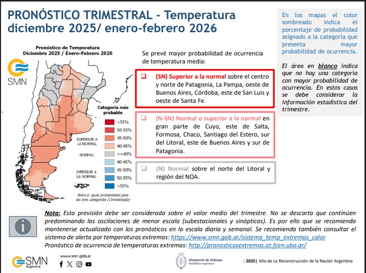 El informe del SMN también señala que las temperaturas medias para el trimestre se mantendrán por encima del rango habitual, que suele oscilar entre los 18°C y 24°C. Con una tendencia generalizada a temperaturas más altas, se prevé que los valores promedio se ubiquen por encima de ese intervalo, lo cual podría tener implicancias en la salud pública, el consumo energético y el comportamiento de los cultivos.