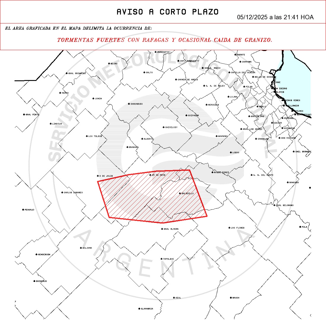 El Servicio Meteorológico Nacional (SMN) ha emitido un Aviso Meteorológico a Muy Corto Plazo (N° 4982) para este 5 de diciembre de 2025, que afecta a varias localidades de la provincia de Buenos Aires. El alerta abarca las ciudades de 25 de Mayo, Nueve de Julio, General Alvear, Las Flores, Roque Pérez y Saladillo, donde se espera la presencia de tormentas fuertes con ráfagas de viento y, en forma ocasional, caída de granizo.