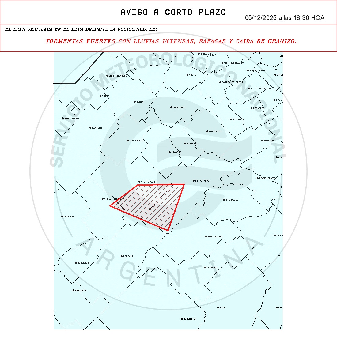 El Servicio Meteorológico Nacional (SMN) ha emitido el Aviso Meteorológico a Muy Corto Plazo N°4973 para las localidades de 25 de Mayo, Nueve de Julio y Carlos Casares, debido a la formación de tormentas fuertes en la zona. El aviso, que entró en vigencia a partir de su emisión, estará activo hasta las 19:30 horas del 5 de diciembre de 2025, hora argentina.