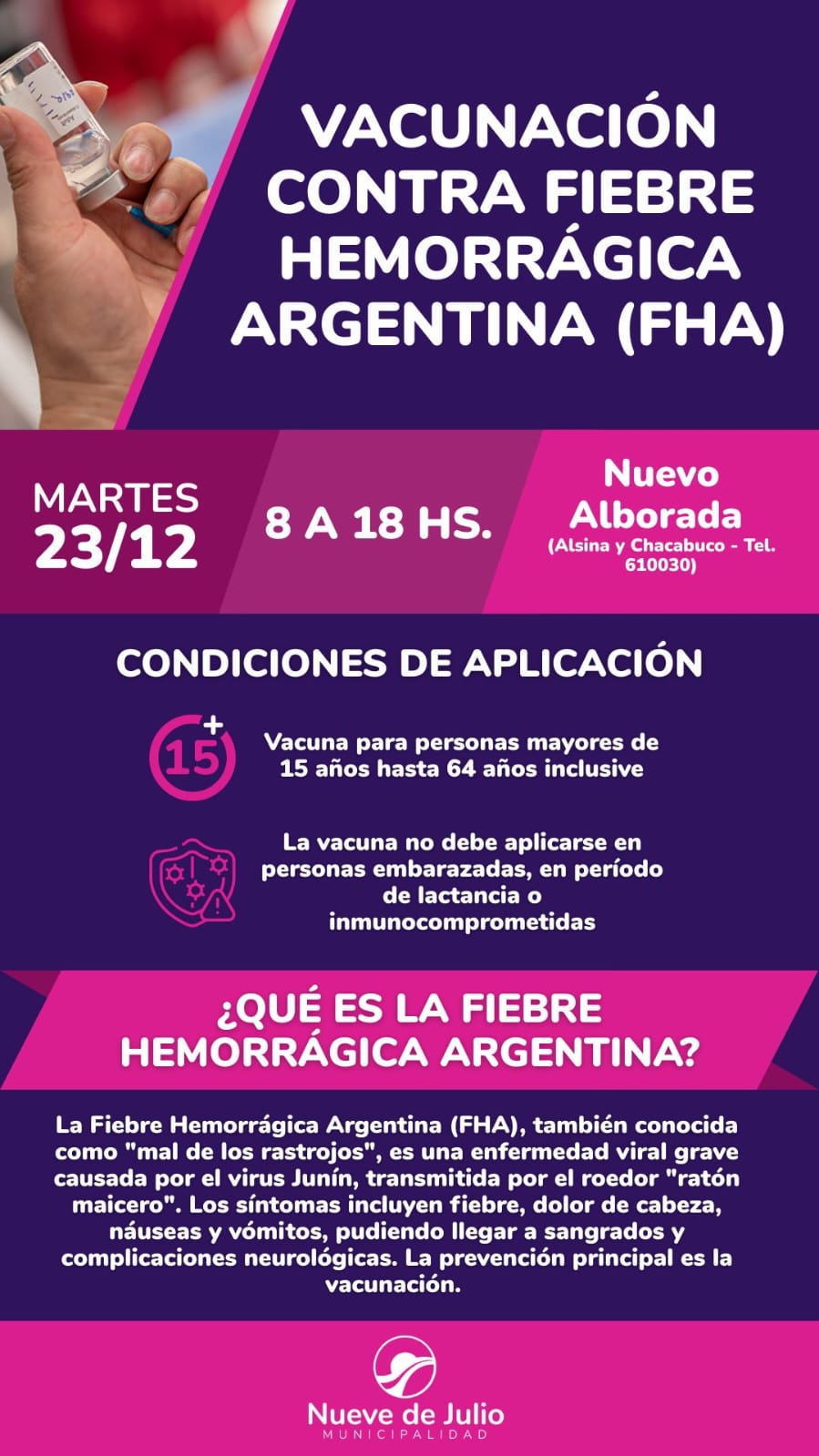 La FHA es una enfermedad viral causada por el virus Junín o ‘Mal de los Rastrojos’, que se transmite principalmente por contacto con roedores infectados, especialmente el “ratón maicero”. Nueve de Julio es zona endémica, por lo que la vacunación de calendario está recomendada para personas de 15 a 64 años, salvo en casos de embarazo, lactancia o pacientes inmunocomprometidos.