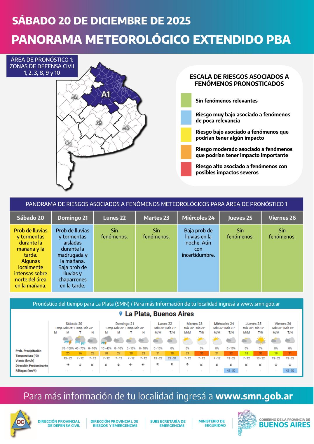 Para el domingo 21 de diciembre, el pronóstico también indica tiempo inestable, especialmente en la madrugada y mañana. Se espera la probabilidad de lluvias y algunas tormentas aisladas en sectores del centro y la franja norte bonaerense, aunque en general, las lluvias serán menos intensas que las de la jornada del sábado. Las condiciones inestables podrían continuar en varias áreas durante las primeras horas del día.