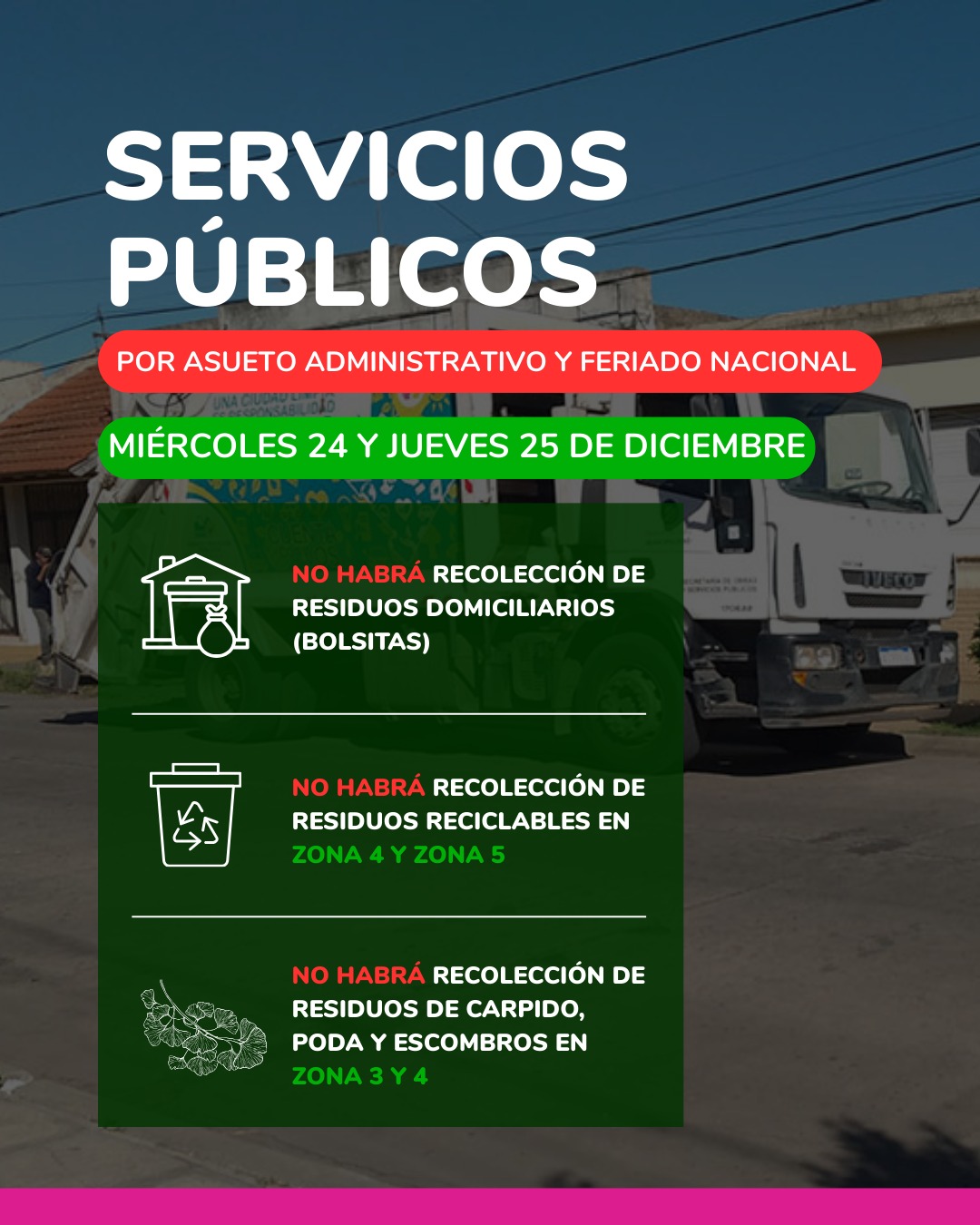 Debido al asueto administrativo y el feriado nacional, los servicios de recolección de residuos en Nueve de Julio sufrirán modificaciones los días miércoles 24 y jueves 25 de diciembre. Durante esas jornadas, no se llevará a cabo la recolección de residuos domiciliarios (bolsitas) en todo el distrito.