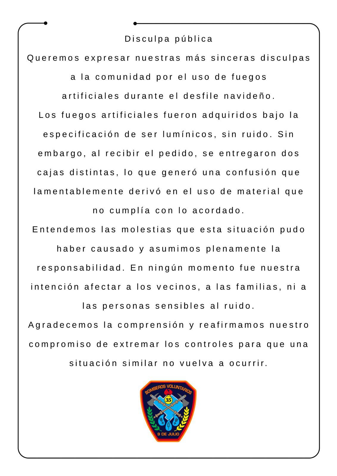Los Bomberos Voluntarios manifestaron su asombro por lo ocurrido y remarcaron que se trató de un error externo, no intencional, que no refleja el compromiso permanente de la institución con el cumplimiento de las normativas vigentes y el respeto por la comunidad.