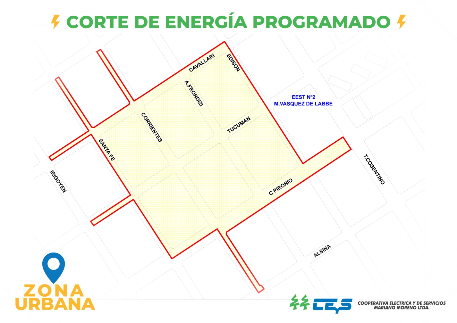 Este sábado 27 de diciembre de 2025, de 06:00 a 11:00 horas, se realizará un corte de energía por tareas de mantenimiento en la zona delimitada en la imagen adjunta (líneas rojas).
