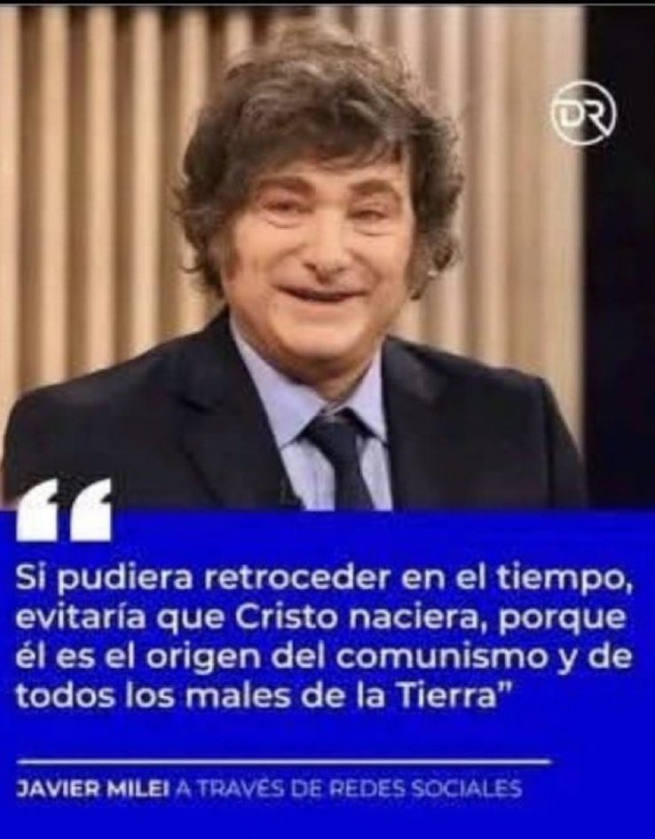 1. El comentarista de la frase de Milei está censurada cuando dice que es la siguiente: “Si pudiera retroceder en el tiempo, evitaría el nacimiento de Cristo, ya que es el mal de todos los tiempos”. Pero Milei dijo exactamente que evitaría el nacimiento de Cristo “porque él (referido a Cristo) es el origen del comunismo”, curioso. En todo caso recordemos que en los albores del capitalismo, una de las demandas de la nueva clase emergente era separar el Estado de la Iglesia. Era una de las propuestas centrales de Máquiavelo en El Príncipe. Era dejar atrás la teocracia. Ahora no era dios ni las religiones sino los seres humanos que se darían sus propias leyes sin participación de la iglesia. Ahora eso no significa estar de acuerdo o criticar esa frase, simplemente que en mi caso bien poca credibilidad le doy a este señor Milei, sobre todo teniendo presente que tiene a la Argentina en el suelo..Para mí es un político que ha perdido la razón. Y por último si bien respeto las creencias religiosas, no las comparto y me declaro atea.