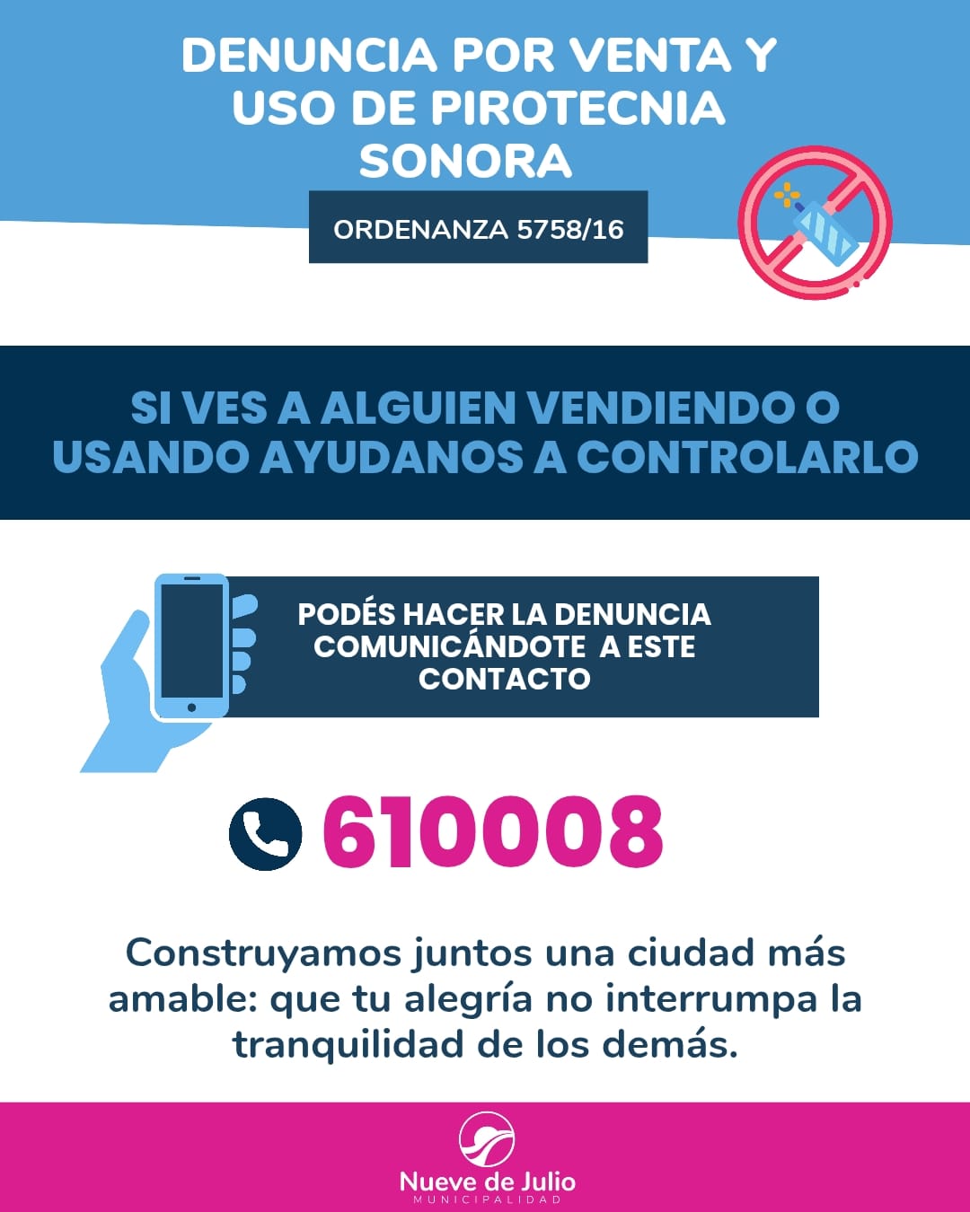 La Municipalidad de Nueve de Julio hizo saber a la comunidad que se encuentra plenamente vigente la Ordenanza N° 5758/16, la cual prohíbe la comercialización, fabricación, depósito y uso de artículos de pirotecnia en todo el partido, conforme a lo establecido en su artículo 2°. El incumplimiento de esta normativa prevé sanciones que van desde 10 hasta 100 módulos, además de la clausura del local comercial o depósito involucrado.