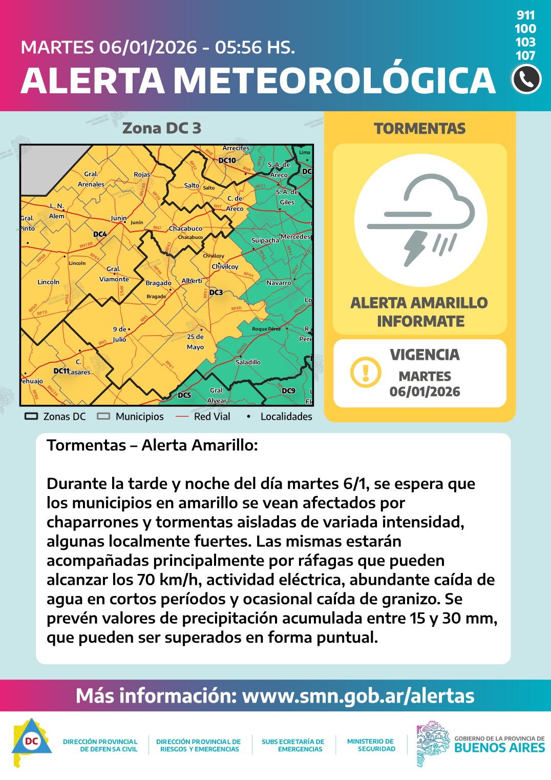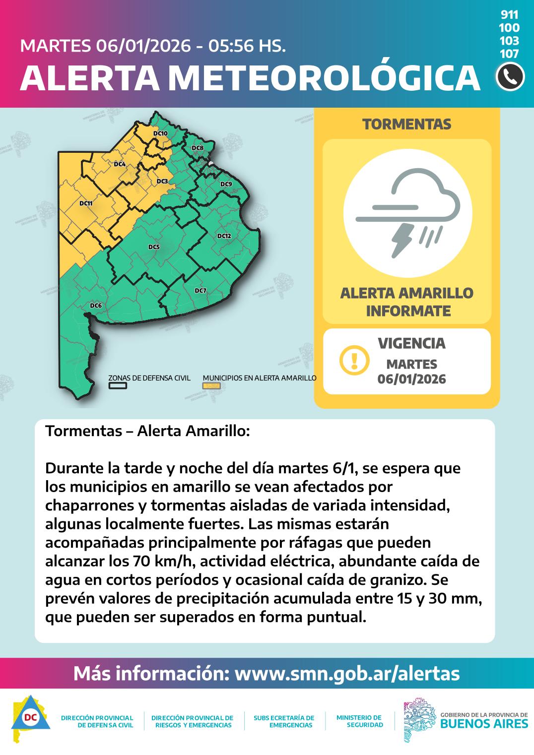 El Servicio Meteorológico mantiene vigente una alerta amarilla por tormentas para este martes 6 de enero debido al avance de un frente frío que se desplazará de oeste a este a lo largo de la jornada. Los municipios alcanzados por la advertencia comenzarían a verse afectados a partir de la tarde, con chaparrones y tormentas aisladas, algunas localmente fuertes.