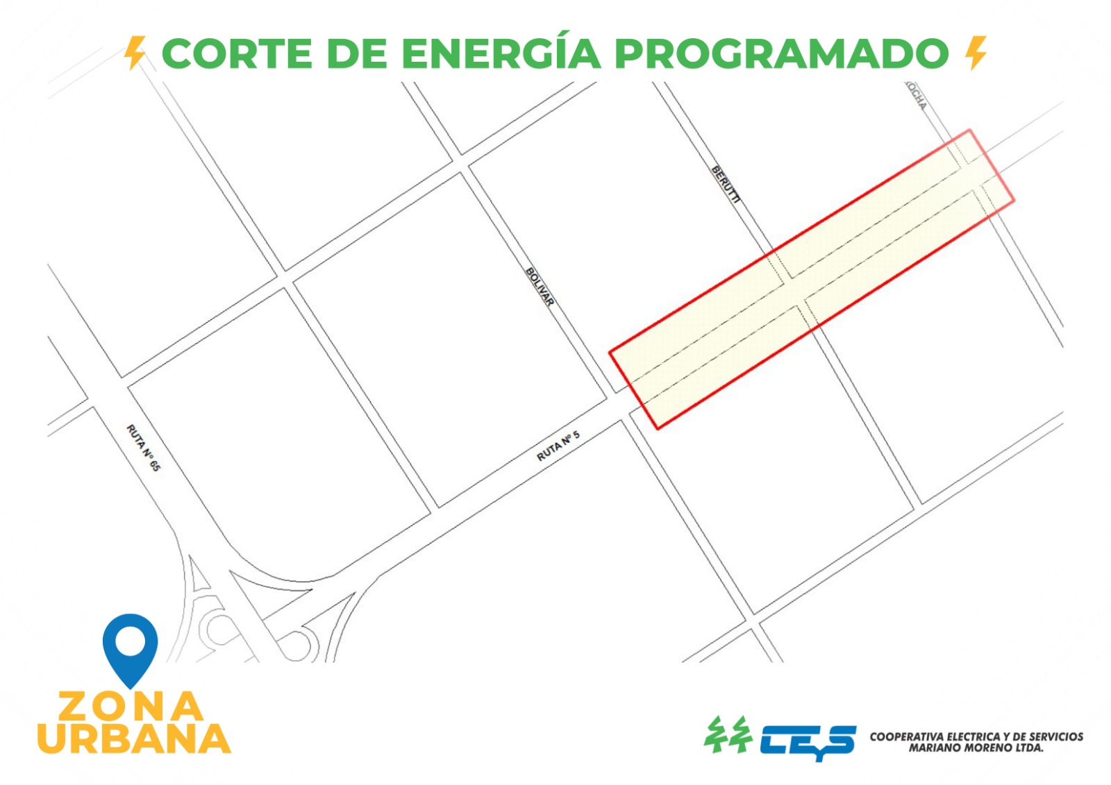 Este jueves 8 de enero de 2026, de 06:00 a 11:30 horas, se llevará a cabo un corte de energía programado en la zona de CEyS Mariano Moreno, específicamente en la altura de la Ruta 5. Este corte es parte de tareas de mantenimiento esenciales para asegurar el correcto funcionamiento del servicio.