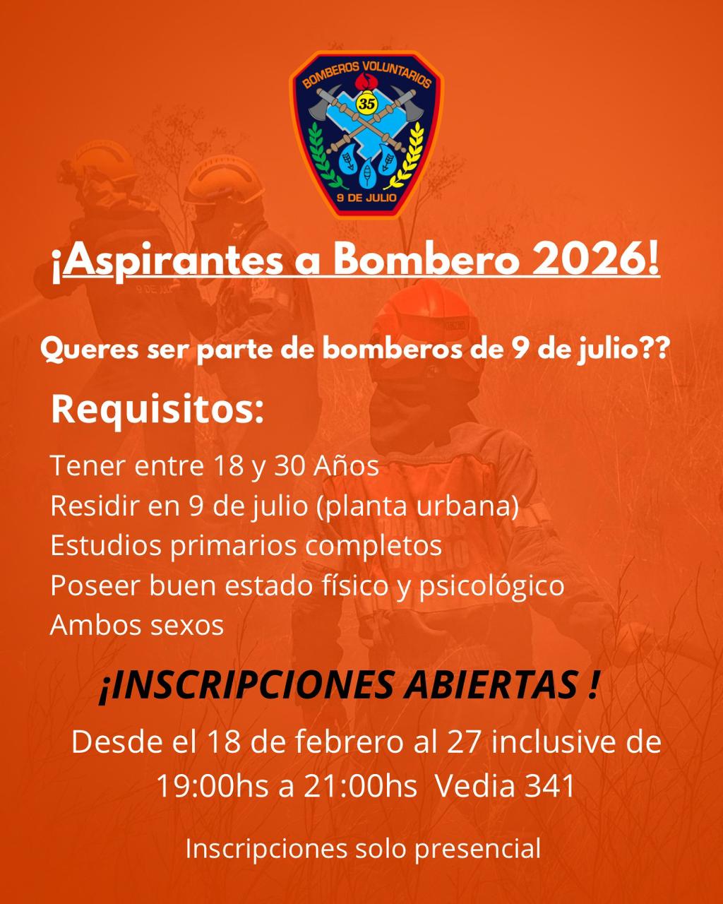 Los Bomberos Voluntarios de 9 de Julio informan a la comunidad que se encuentra abierta la inscripción para Aspirantes a Bombero – Promoción 2026, una oportunidad destinada a jóvenes con vocación de servicio que deseen sumarse a una de las instituciones más importantes y comprometidas de la ciudad.