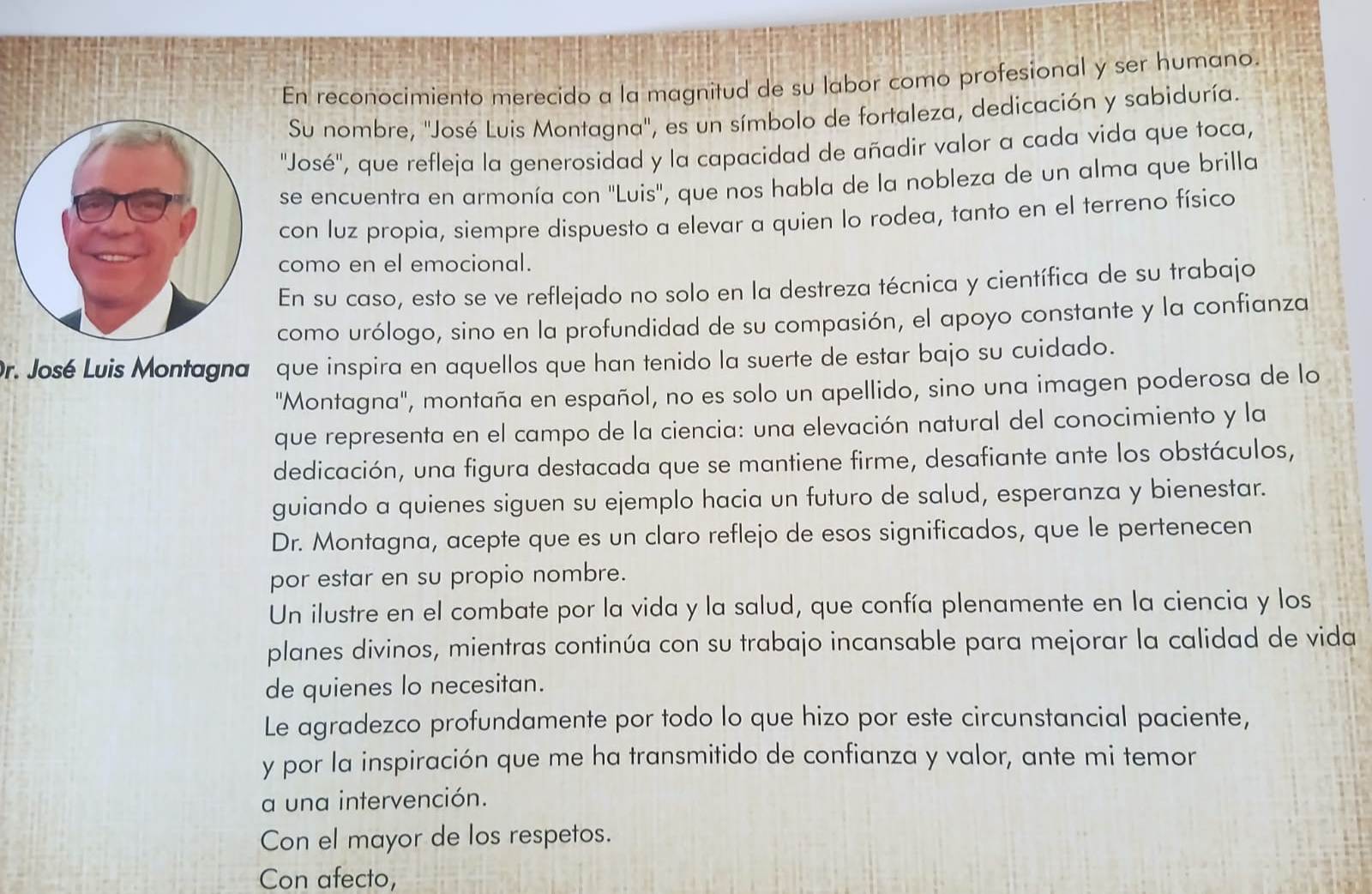 El paciente, lleno de gratitud, le dedicó un mensaje al Dr. Montagna, resaltando no solo su habilidad médica, sino también la nobleza de su alma. “Su nombre, José Luis Montagna, es un símbolo de fortaleza, dedicación y sabiduría. En él se combinan la generosidad y la nobleza, y su apellido ‘Montagna’, que significa montaña, es un reflejo de su firmeza ante los obstáculos y su capacidad para guiarnos hacia un futuro de salud y esperanza”, expresó el paciente en su carta al médico.