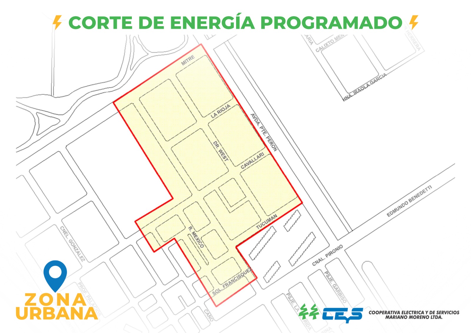 La Cooperativa de Servicios CEyS informa a la comunidad que, el este martes 3 de febrero, se llevará a cabo un corte de energía programado en un sector de la ciudad debido a tareas de mantenimiento. El corte afectará a la zona delimitada en la imagen adjunta, marcada con líneas rojas.