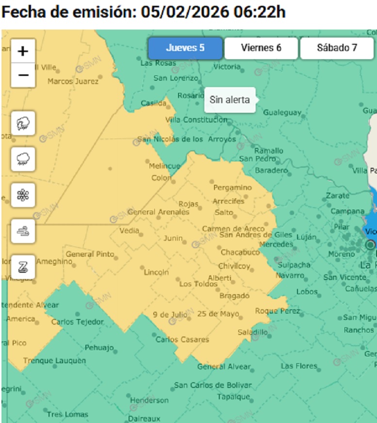 Este jueves 5 de febrero, se mantendrá activa una alerta amarilla por tormentas en diversas zonas de la provincia. Durante lo que resta de la mañana, se prevén lluvias y tormentas de diversa intensidad, algunas de las cuales podrían alcanzar niveles fuertes, especialmente en el noroeste provincial. Las áreas más afectadas incluyen las zonas DC 4, el norte de DC 11 y el oeste de las zonas 3 y 10. En estas áreas, se espera que las tormentas vengan acompañadas de intensa actividad eléctrica, ocasionales caídas de granizo, fuertes lluvias en cortos períodos y ráfagas de viento localmente intensas.