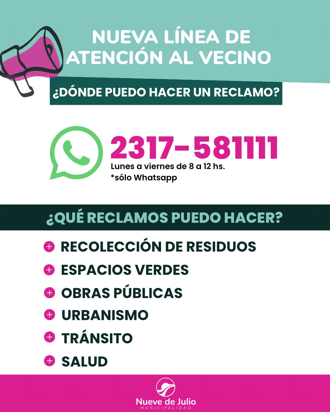 A través del número 2317-581111, disponible únicamente por WhatsApp, los vecinos podrán efectuar consultas y reportar problemas de lunes a viernes, entre las 8 y las 12 horas. Este servicio está diseñado para gestionar reclamos vinculados a la recolección de residuos, el cuidado de espacios verdes, las obras públicas, el urbanismo, el tránsito y la salud.