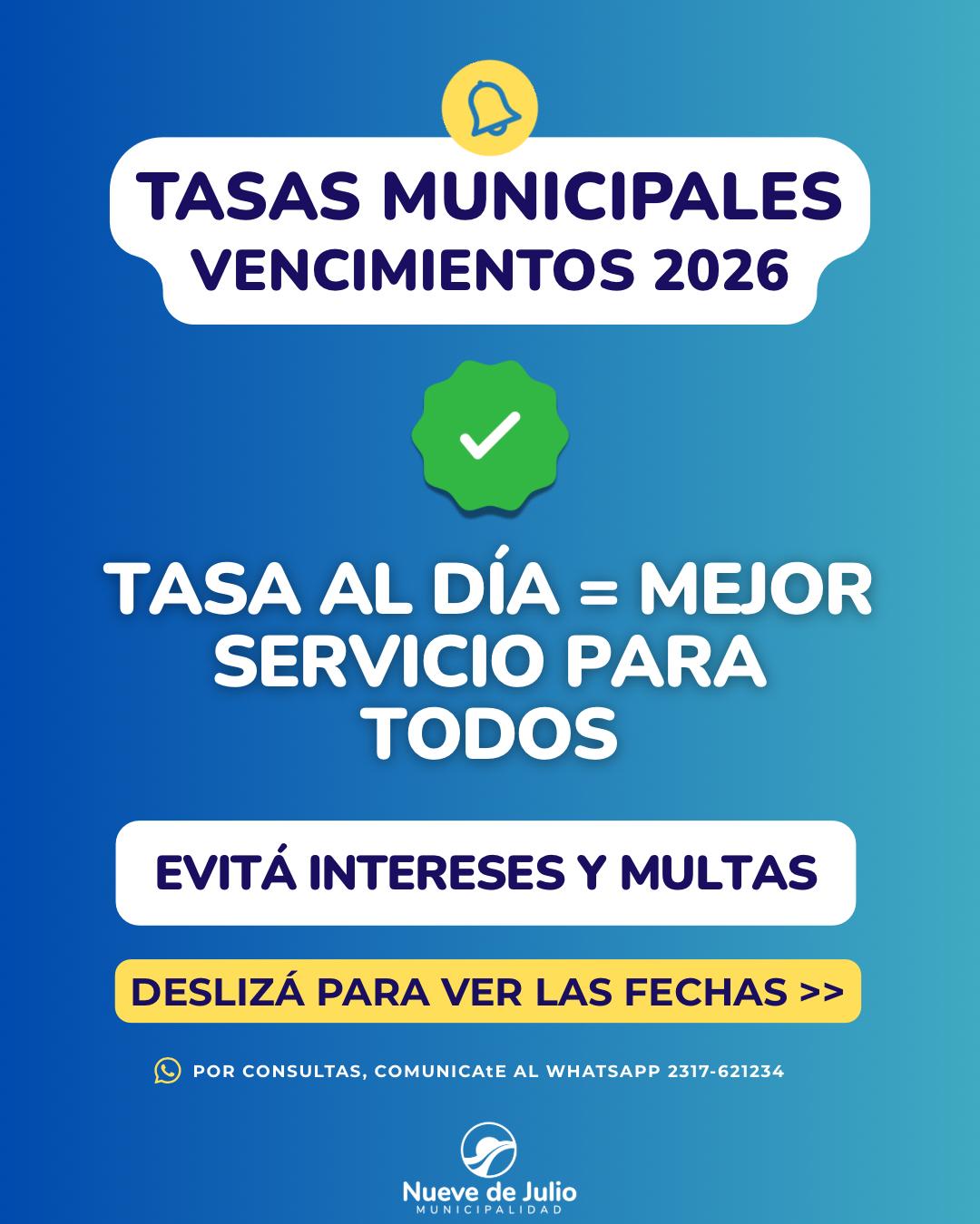 La Municipalidad de Nueve de Julio, a través de la Oficina de Ingresos Públicos, informa a los vecinos sobre los próximos vencimientos de tasas municipales, con el objetivo de facilitar el cumplimiento en tiempo y forma.