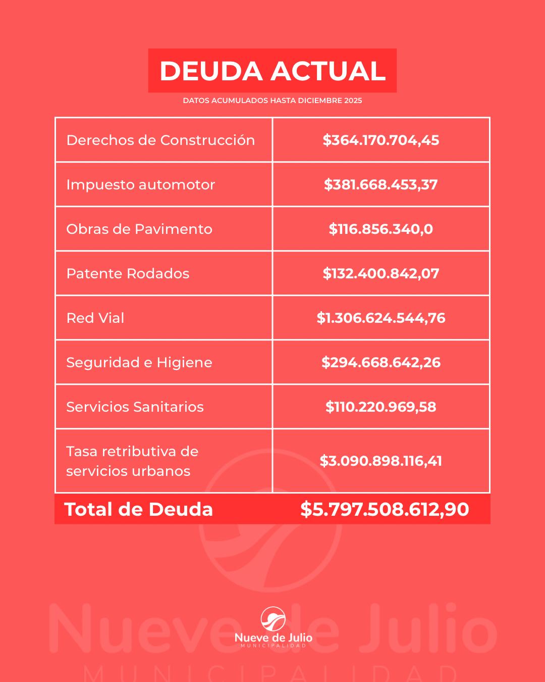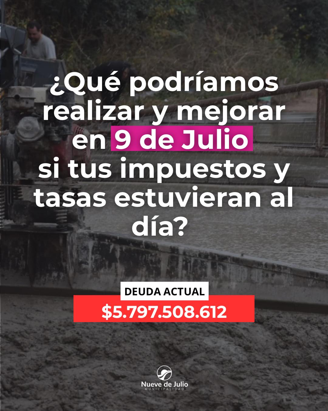 La Municipalidad de Nueve de Julio informa que la deuda acumulada en concepto de tasas e impuestos municipales asciende a $5.797.508.612, lo que impacta directamente en la capacidad del Estado local para sostener y ampliar obras públicas, renovar equipamiento y garantizar la prestación eficiente de los servicios básicos en todo el distrito. La deuda refleja atrasos significativos en distintos tributos, como el impuesto automotor, la patente rodado, pavimento, red vial, seguridad e higiene, servicios sanitarios, derechos de construcción y la tasa retributiva de servicios urbanos, que concentra el mayor volumen de mora. El cumplimiento de estas obligaciones es fundamental para sostener el funcionamiento cotidiano de la ciudad y continuar con el desarrollo de infraestructura. Si las gestión estuviera al día, el distrito podría avanzar en inversiones concretas, como la incorporación de equipamiento clave y la ejecución de obras de infraestructura. La falta de responsabilidad en el pago de tasas e impuestos no sólo afecta a las arcas públicas, sino que repercute directamente en la comunidad, limitando la posibilidad de ampliar servicios, realizar obras estructurales y responder con mayor rapidez a las demandas cotidianas. Cada contribución vuelve a la comunidad en forma de obras, servicios y mejoras concretas para la ciudad y las localidades del partido de Nueve de Julio.