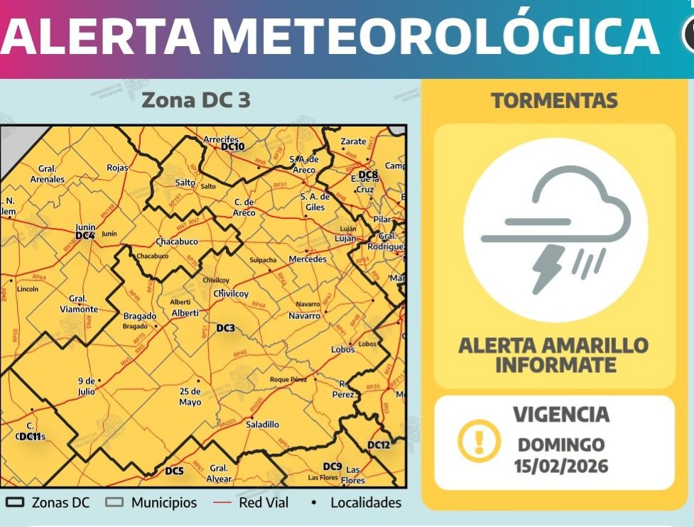 La provincia de Buenos Aires se encuentra bajo Alerta Meteorológica Amarilla por tormentas que impactarán entre la madrugada y la mañana del domingo 15 de febrero de 2026. Según el informe oficial, los municipios señalados en amarillo serán afectados de oeste a este por lluvias y tormentas de variada intensidad, algunas de ellas localmente fuertes.