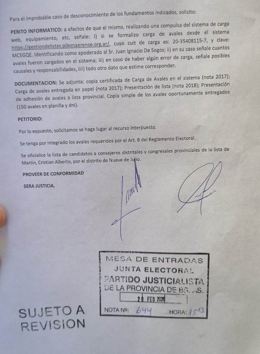 Desde el sector se señaló que fueron presentado todo, en tiepo y forma, lo virtual y físico ya sea el Excel con los avales digitales como lo on line. Lo que importa es lo que dice el papel, como establece el artículo 7 del reglamento de la Junta Electoral del PJ se recordó. A pesar de este respaldo, la lista quedó bajo observación.