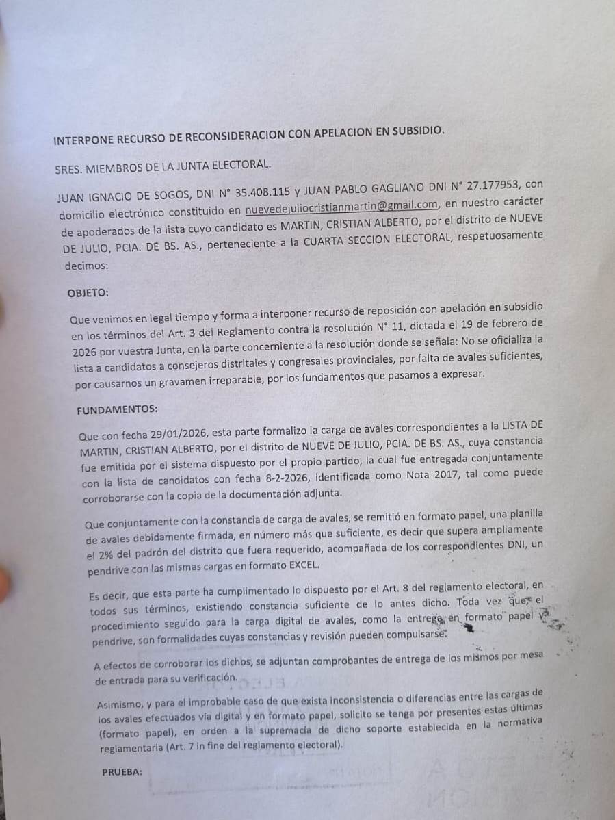 La apelación será revisada nuevamente por la Junta Electoral en una reunión que se llevará a cabo a las 19:00 horas de este viernes. A partir de esa decisión, se definirá si la lista de Cristian Martin podrá finalmente presentarse en las internas del 15 de marzo, o si, por el contrario, se verá desplazada en favor de la lista oficialista de Ippoliti.