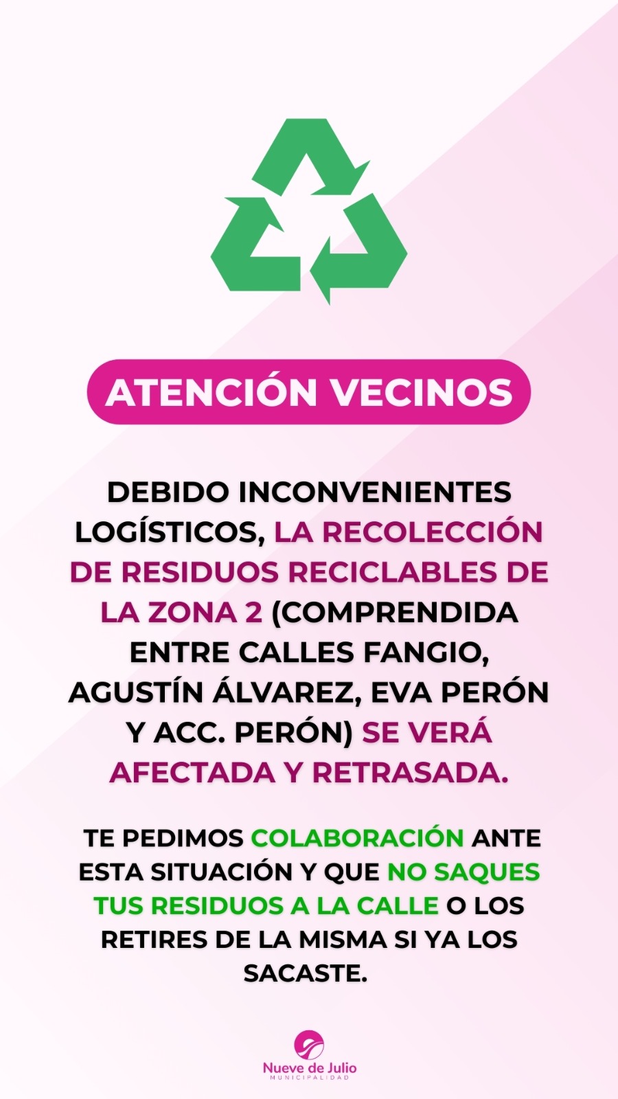 Por inconvenientes logísticos, la recolección de residuos reciclables en la Zona 2 registrará demoras durante los próximos días. La medida impacta en el área comprendida entre las calles Fangio, Agustín Álvarez, Eva Perón y Acceso Perón.
