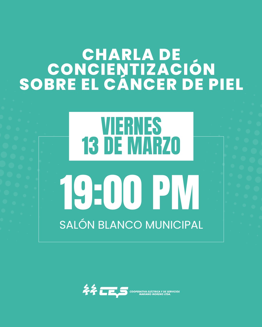 Las actividades continuarán a las 19:00 con una Charla de Concientización sobre Cáncer de Piel, destinada al público en general. El encuentro se desarrollará en el Salón Blanco de la Municipalidad y estará a cargo de la Dra. Fernández García, quien abordará aspectos relacionados con la prevención, la detección temprana y los cuidados frente a la exposición solar.