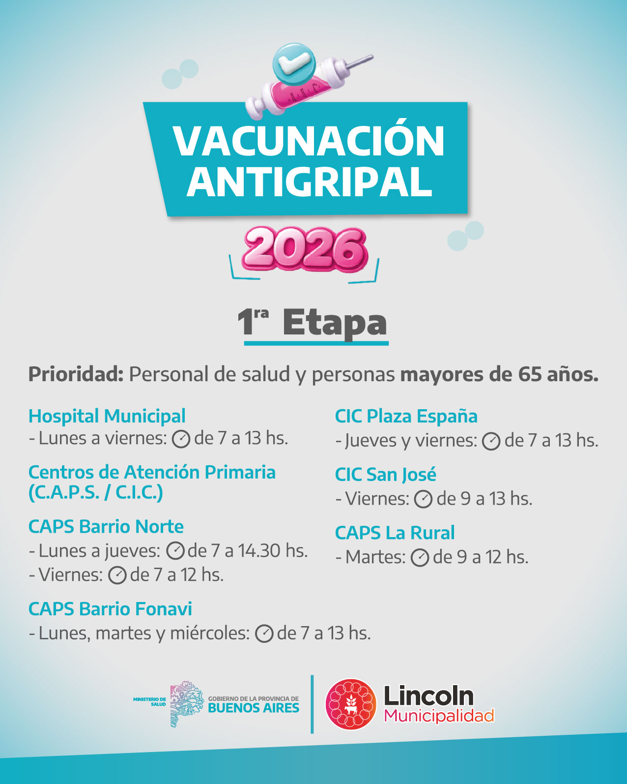 La Municipalidad de Lincoln inició este miércoles 11 de marzo la campaña de vacunación antigripal 2026, dirigida en esta primera etapa al personal de salud y a la población de adultos mayores de 65 años de edad. El objetivo es inmunizar a la población más expuesta al virus influenza, causante de la gripe, y reducir las complicaciones, hospitalizaciones, muertes y secuelas ocasionadas por la enfermedad. La vacunación es gratuita, no requiere orden médica y puede aplicarse junto a otras vacunas. Los lugares de vacunación son: