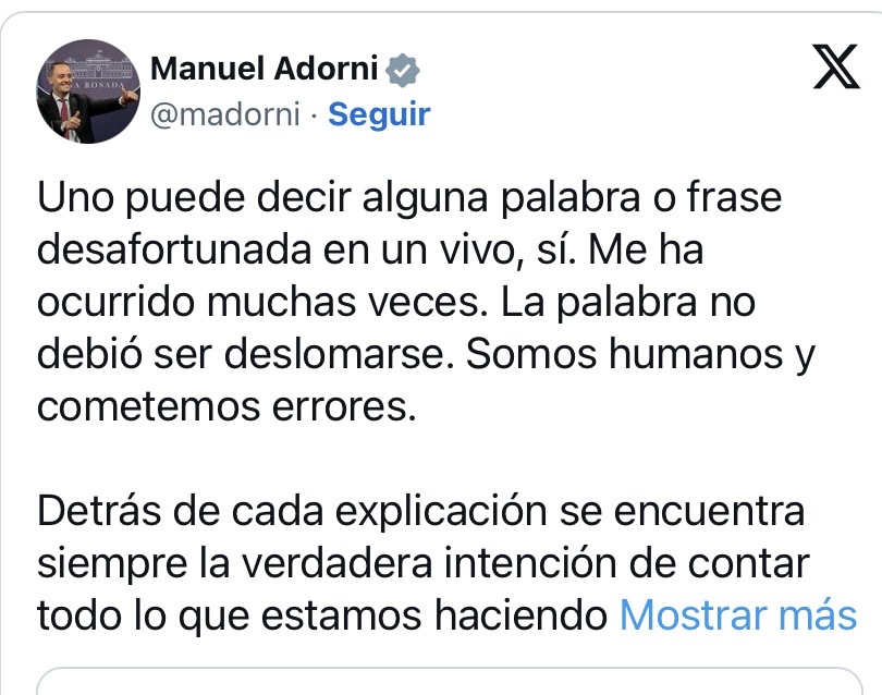 El jefe de Gabinete, Manuel Adorni, se refirió finalmente al escándalo que involucró a su esposa, Betina Angeletti, quien participó de un viaje oficial a Nueva York junto a él y funcionarios del Gobierno. En un posteo en su cuenta de X, Adorni reconoció que cometió un error y se disculpó por su comportamiento. “Somos humanos y cometemos errores”, escribió Adorni, admitiendo que la palabra “deslomarse” no debió ser utilizada. El jefe de Gabinete también destacó que su intención era trabajar por el cambio en Argentina y agradeció el apoyo del gabinete nacional y del Presidente de la Nación.
