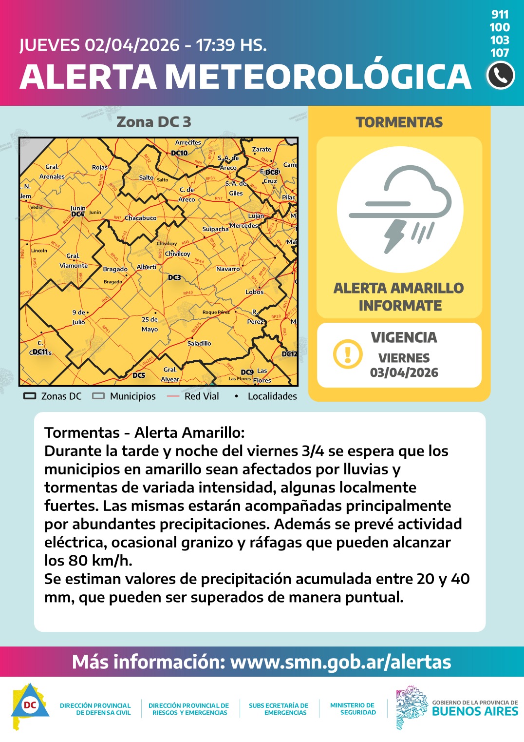 Se pronostican lluvias fuertes para lo que resta de la tarde de este viernes y durante la noche en un amplio sector de la provincia de Buenos Aires, incluyendo a Nueve de Julio, que se encuentra bajo alerta amarilla. Para el sábado se esperan lluvias aisladas, mientras que las precipitaciones podrían continuar durante la madrugada.