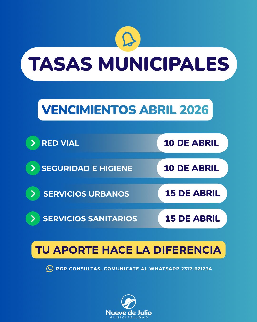 La Municipalidad de Nueve de Julio, a través de la Oficina de Ingresos Públicos, informó a los vecinos sobre las fechas de vencimiento de las tasas municipales correspondientes al mes de abril, recordando la importancia de mantener al día los pagos para evitar recargos.