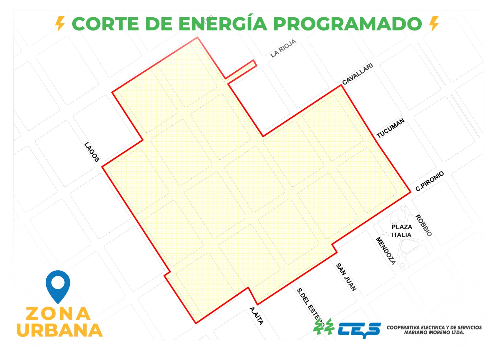 El CEyS Mariano Moreno informó que, el jueves 9 de abril de 2026, se llevará a cabo un corte de energía programado en el horario de 07:30 a 09:30 horas. Las tareas de mantenimiento se concentrarán en la zona delimitada en la imagen compartida por la institución con líneas rojas.