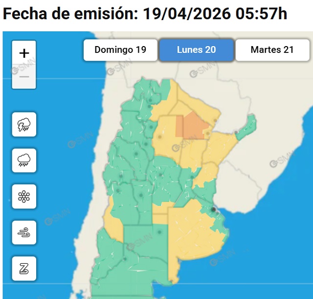 La Dirección de Servicios Meteorológicos Nacionales (DSMN) informó a poco antes de la hora 6 de este domingo que gran parte de la provincia, incluyendo Nueve de Julio, se encuentra bajo alerta amarilla este lunes 20 por condiciones meteorológicas inestables.