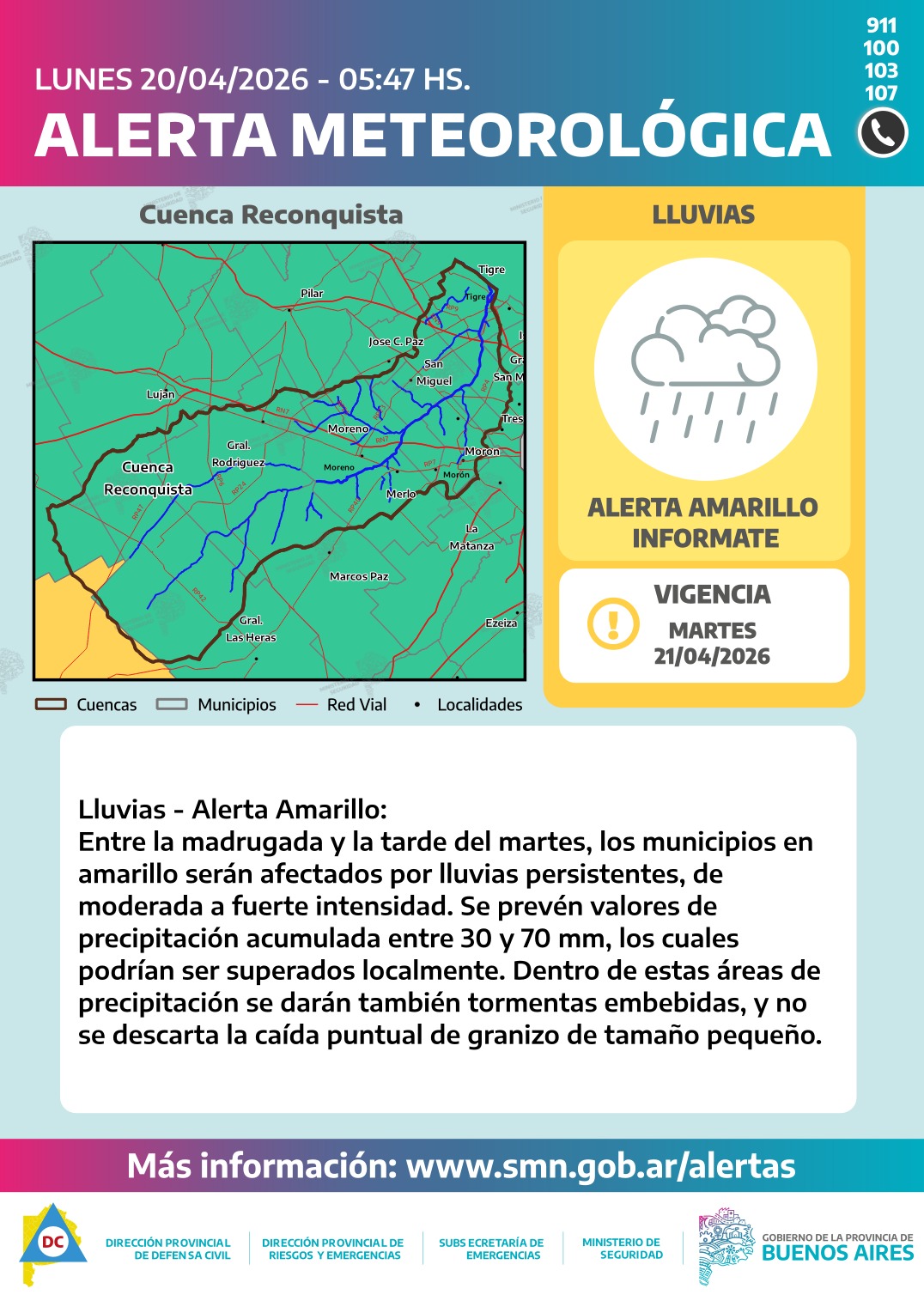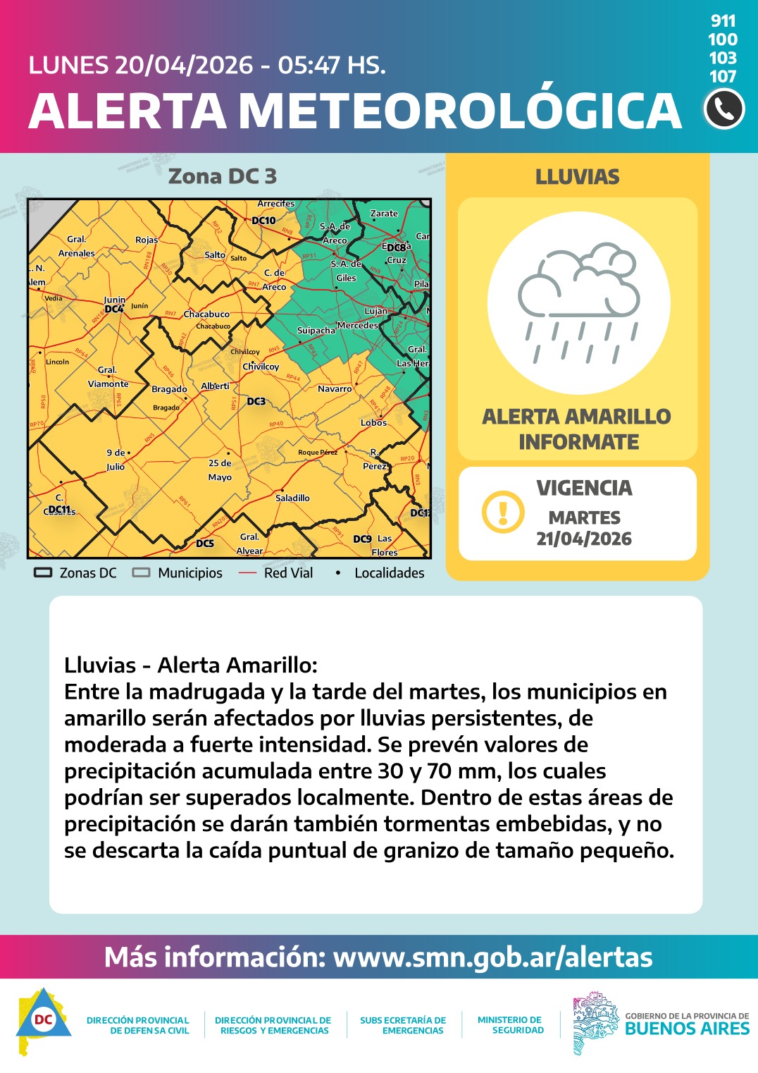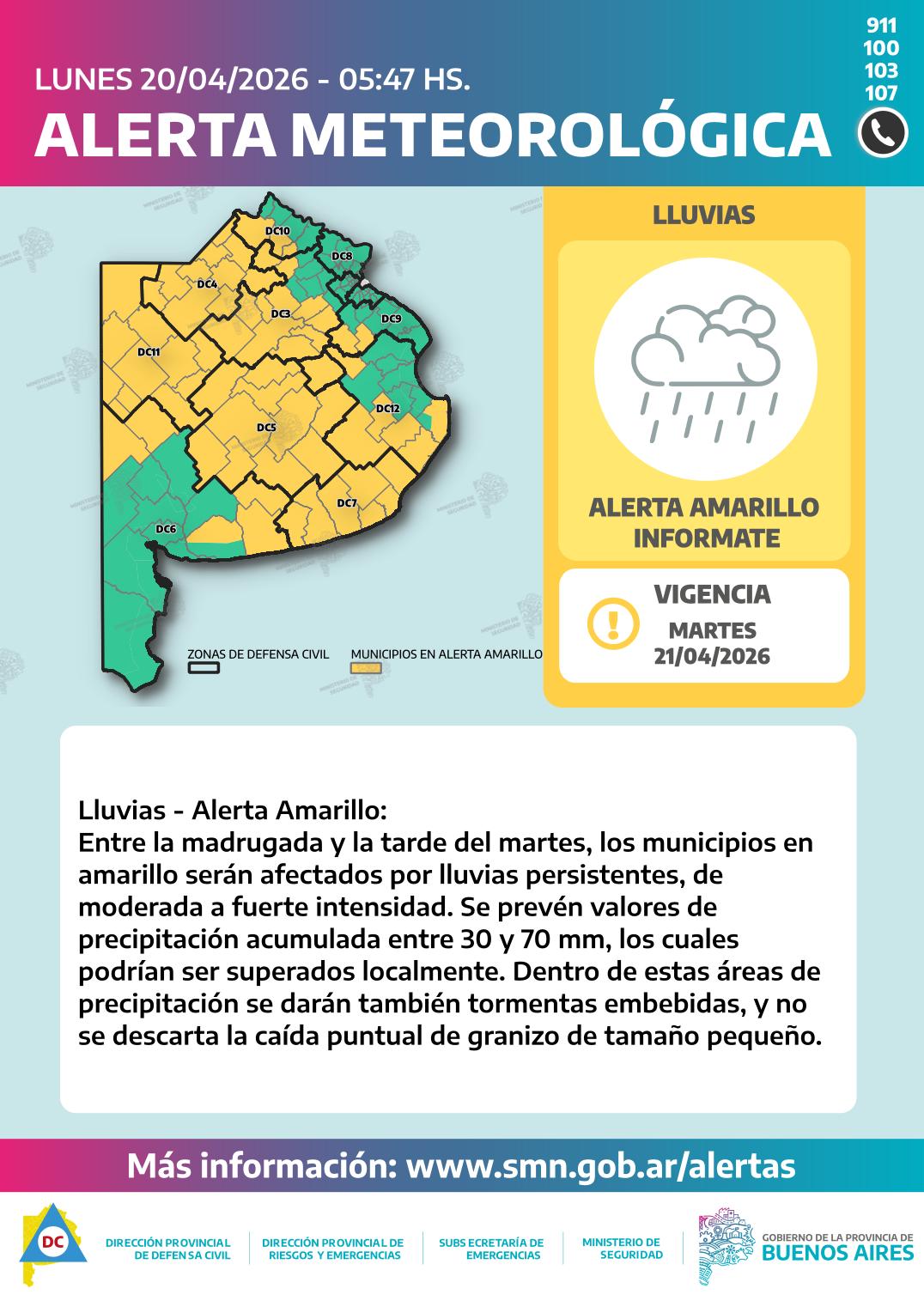 La provincia de Buenos Aires atraviesa desde la madrugada de este lunes 20 un evento meteorológico marcado por lluvias persistentes y condiciones inestables que se extenderán al menos hasta la tarde del martes 21. El fenómeno responde a la presencia de un frente estacionario sobre el centro del territorio, lo que genera precipitaciones continuas con tormentas embebidas de variada intensidad.